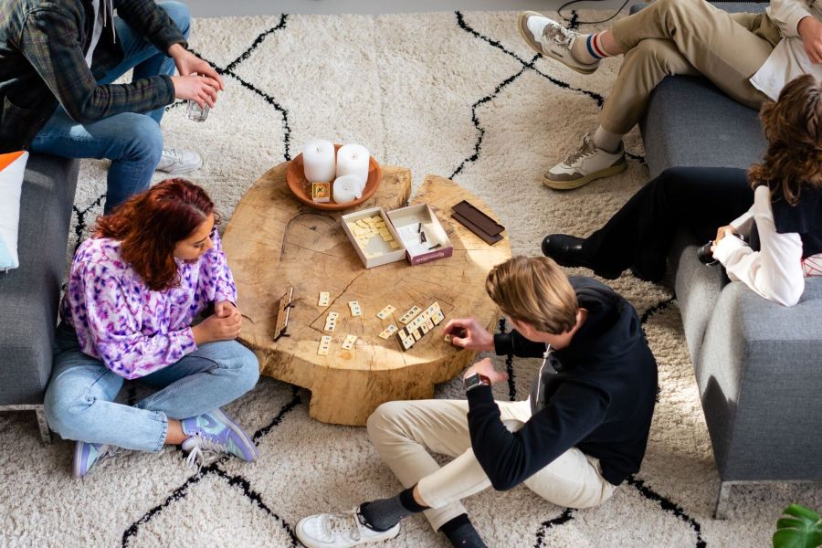 Het gebouw is zo ingericht dat je makkelijk je leeftijdsgenoten kunt ontmoeten als je daar zin in hebt. Bijvoorbeeld in de gemeenschappelijke ruimte, waar je kunt werken, sporten, koffie drinken, gamen, een pizza delen of een film kijken.